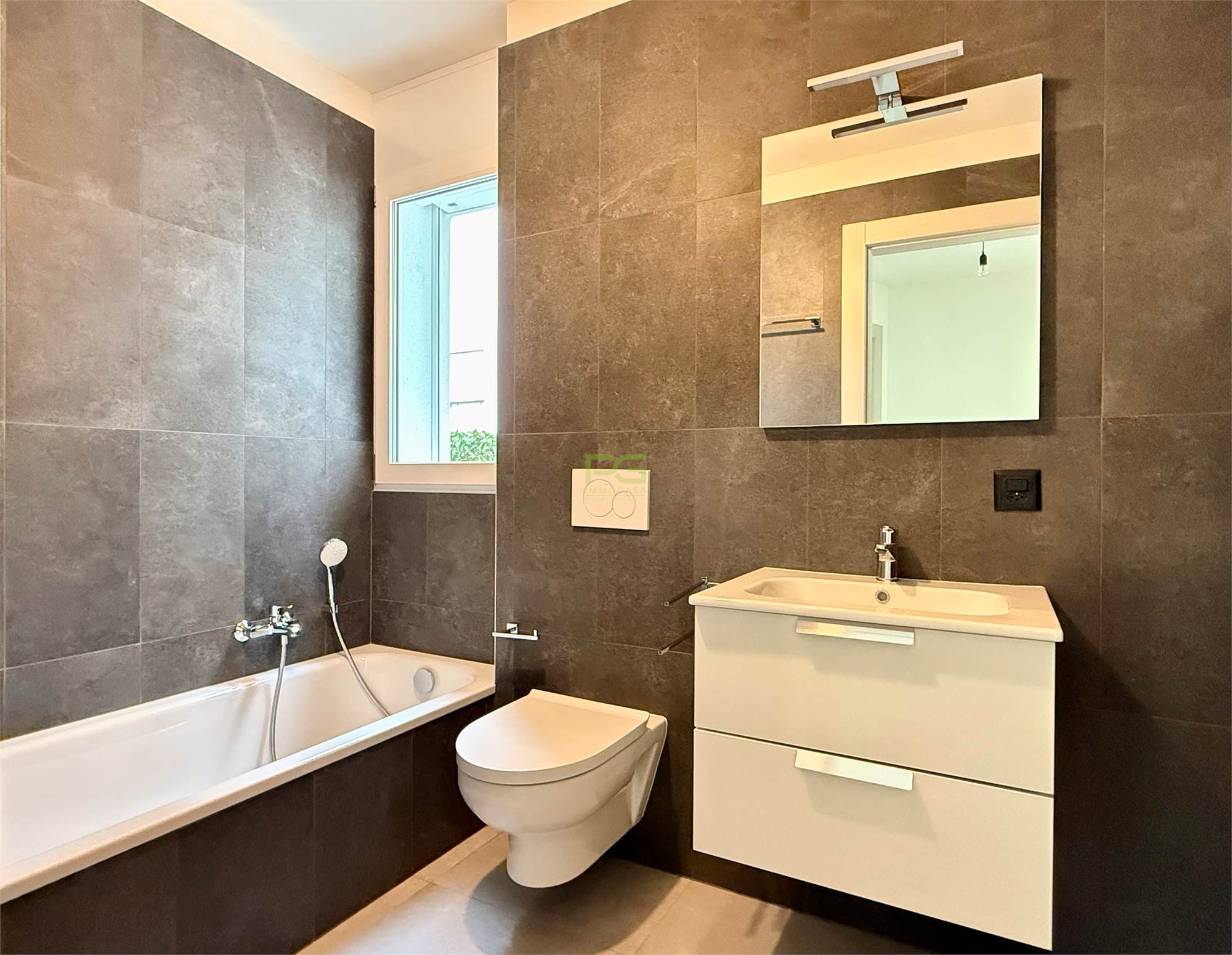 . bagno con vasca, attacco per lavatrice e asciugatrice, finestra
